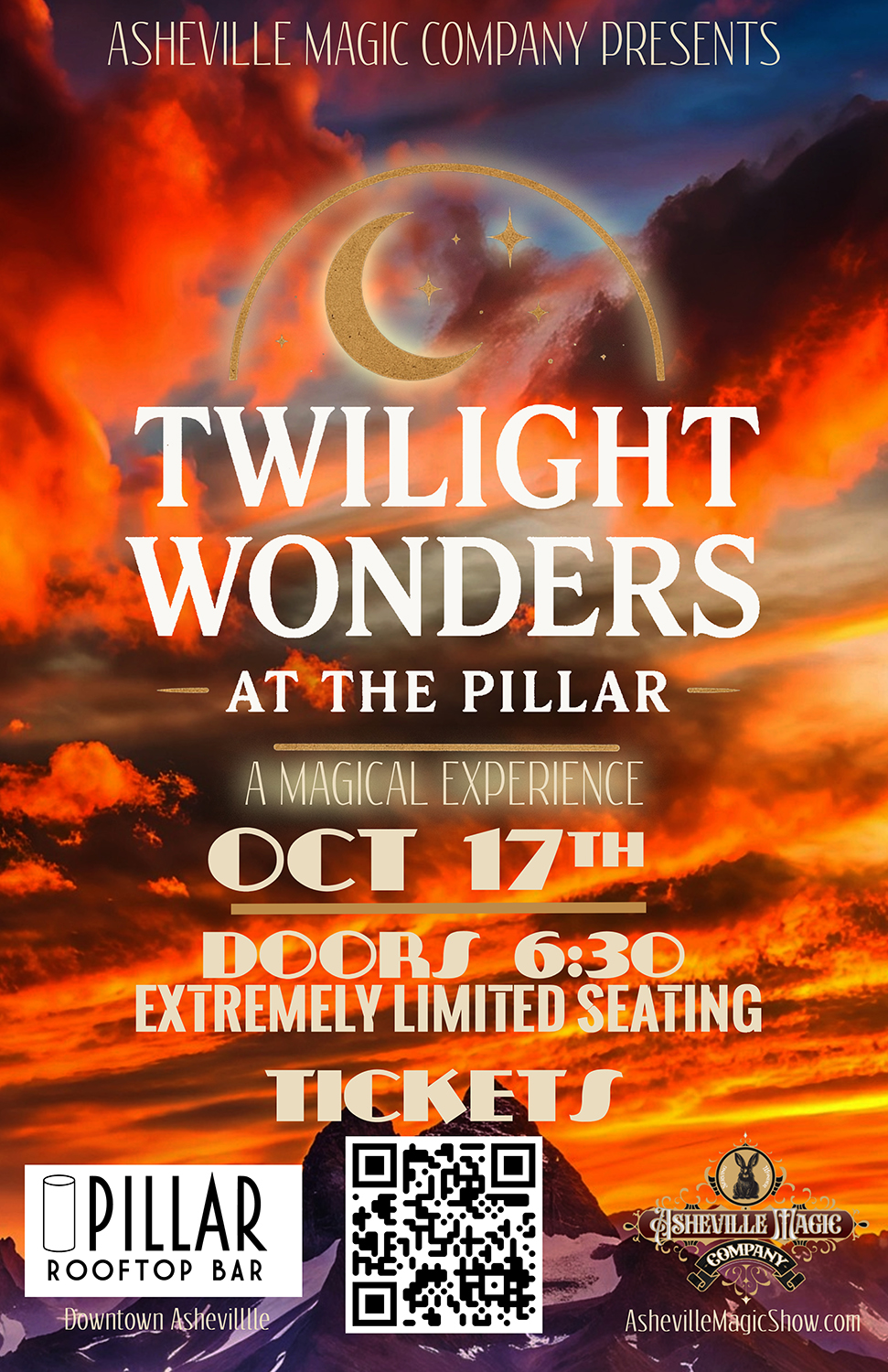 Asheville Magic Company and Pillar Rooftop Bar presents Twilight Wonders at the Pillar. See 3 of the world’s best magicians in this immersive evening of wonder. October 17th at the Pillar Bar. Our private space only holds 40 so tickets will go fast. Featuring magicians Evan Driggs, Criswell Traveling Magician and Doc Docherty