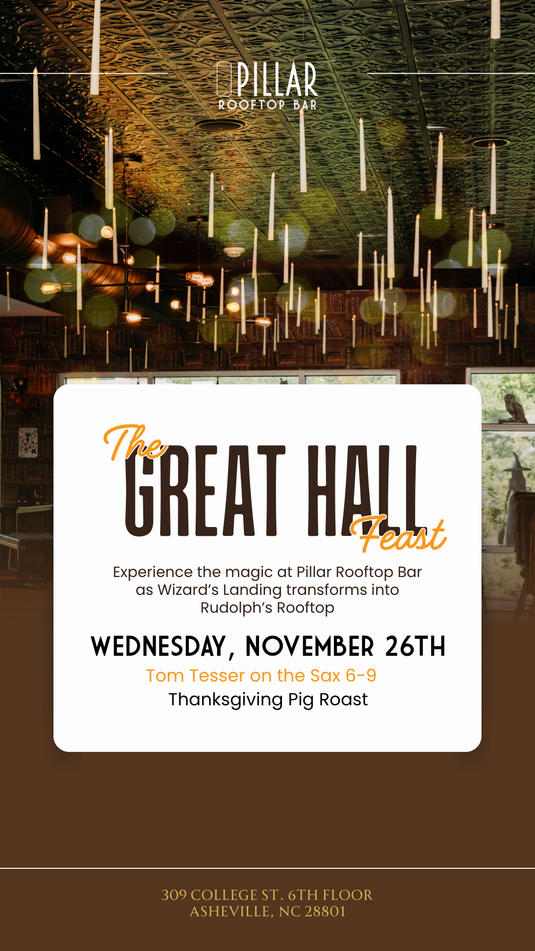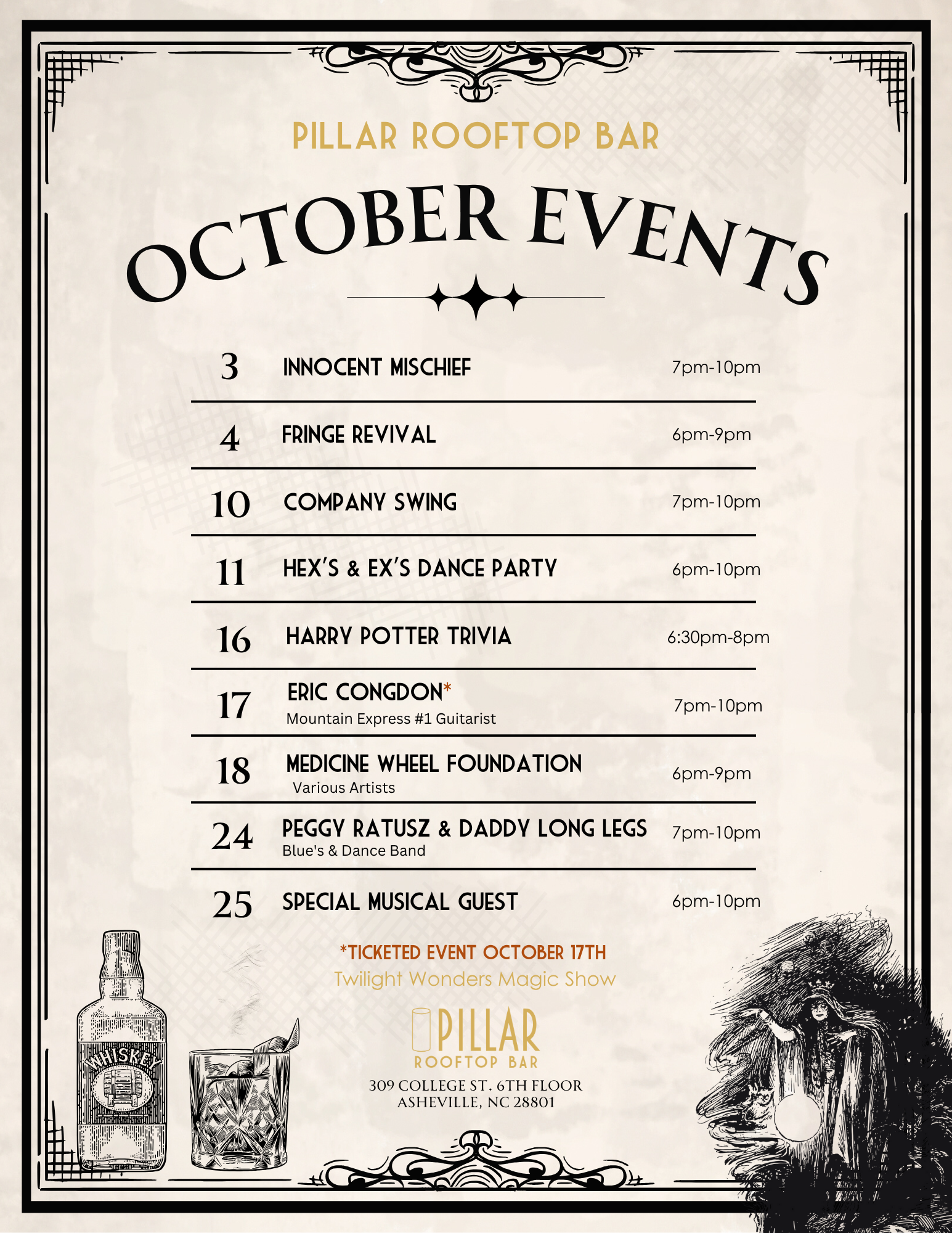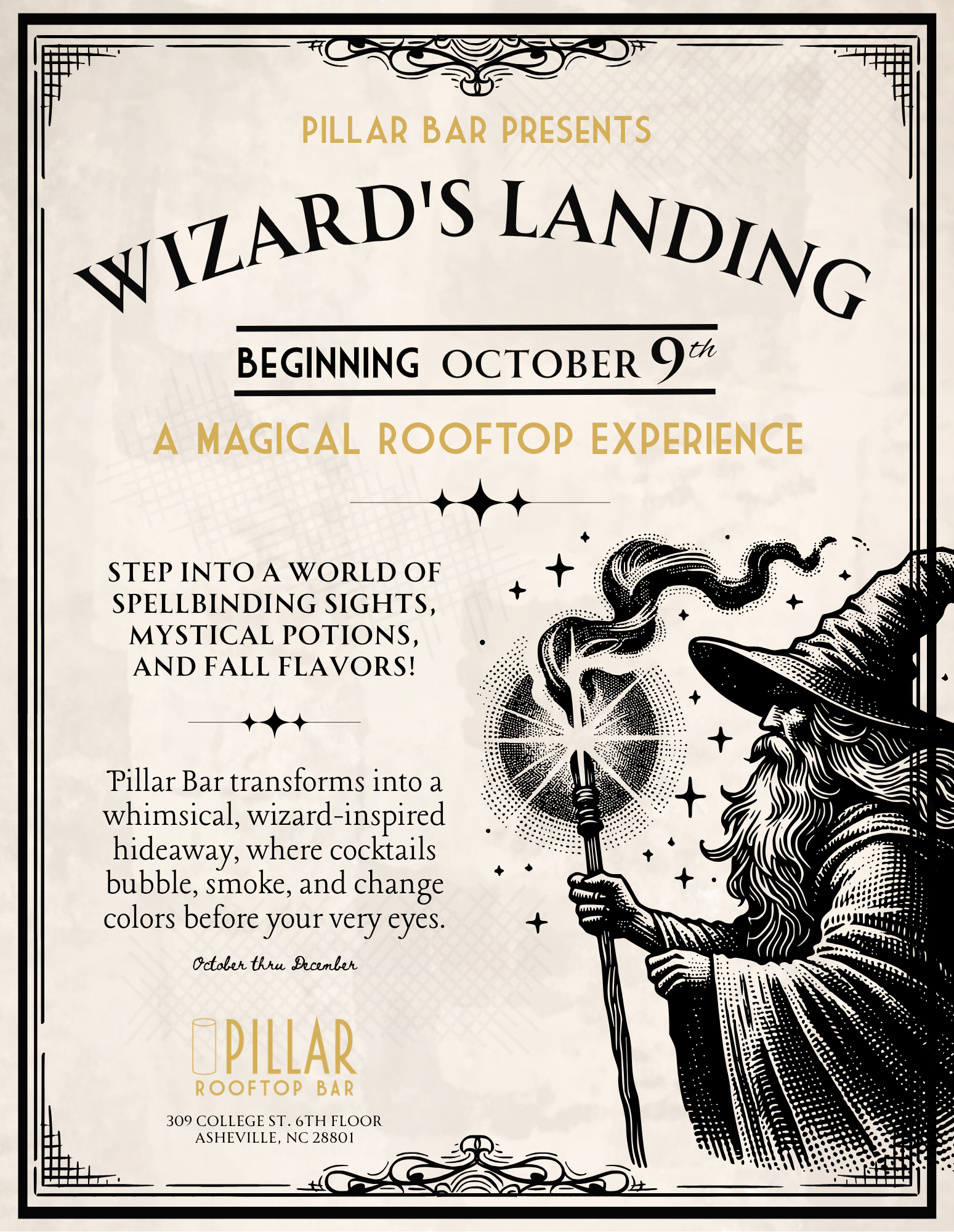 Experience the Pillar Rooftop Bar you know and love—now with a magical twist. Sip on fall-inspired cocktails, enchanted elixirs, and seasonal bites, all with spellbinding skyline views. Cozy up by the fire pit, soak in the mountain air, and let a little rooftop wizardry elevate your evening in Asheville.