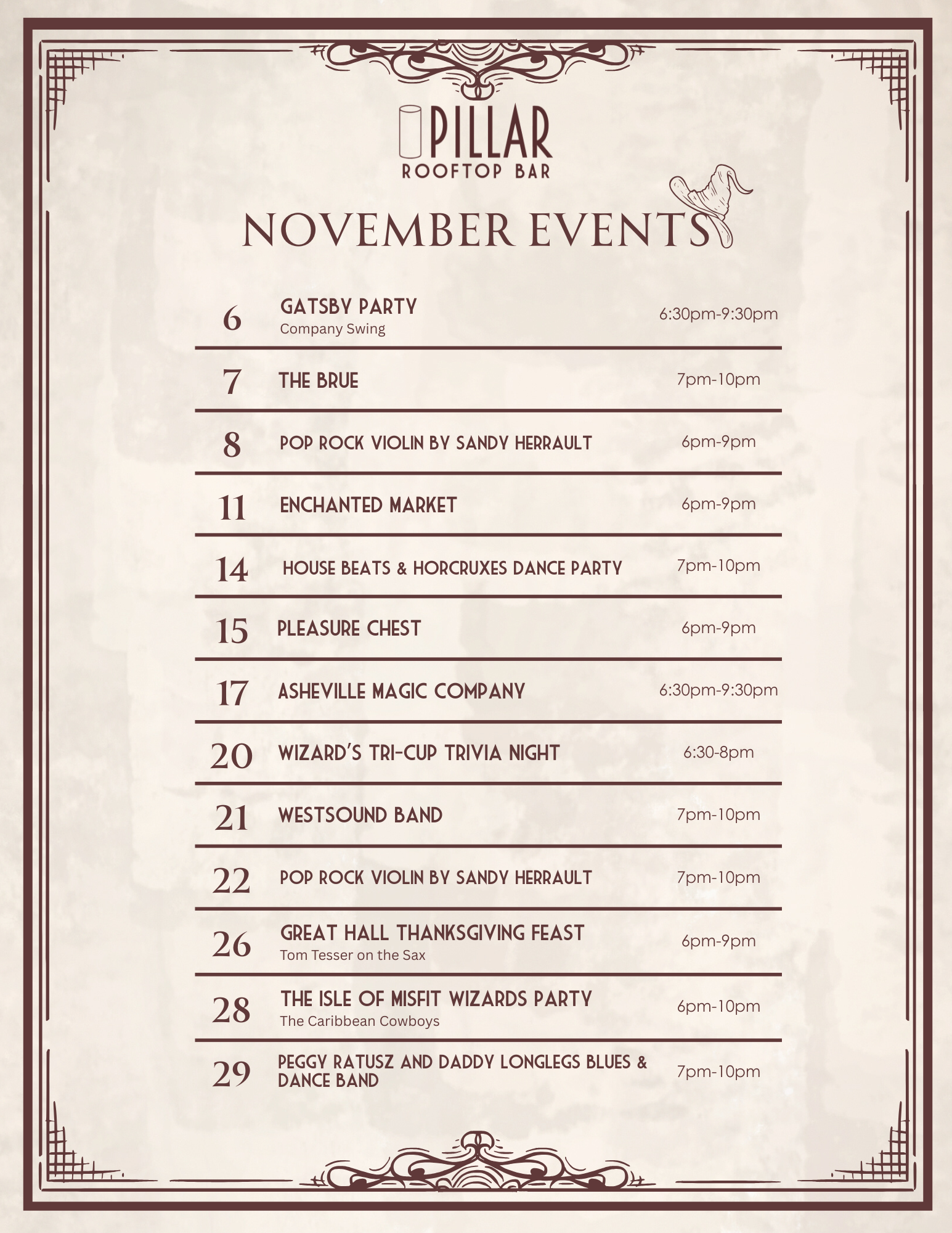 Step into the spellbinding sounds of House Beats & Horcrux at Pillar Rooftop Bar. Join us Friday, November 14th from 7–10 PM, for a night that blends mystical energy with irresistible rhythm.
